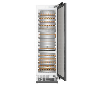 A Adega de Vinhos Elanto possui porta com Vidro Triplo com moldura SEAMLESS, contribuindo para a manutenção da temperatura correta, mesmo em condições extremas. Além disso, a porta é reversível flip-over 180º e sua abertura é de 90°, facilitando o acesso aos vinhos.